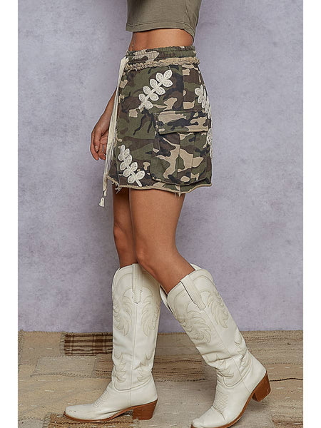Crafted from printed terry fabric, this regular-fit mini skirt delivers both style and substance. The exaggerated cargo pockets provide practical storage without compromising the silhouette, while intricate crochet patch detailing adds textural sophistication. The camouflage-inspired olive print offers versatile styling options for contemporary wardrobes. A modern essential that balances utility with refined design sensibilities.