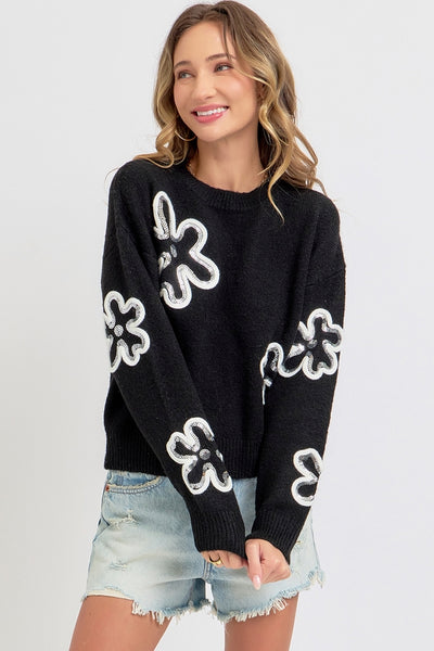 The Erin Sequins Floral Black Sweater combines elegant floral sequin accents with a soft sweater knit fabric for lasting comfort. Its relaxed fit and round ribbed neckline provide a stylish yet understated silhouette, while long sleeves finished with ribbed cuffs ensure a refined look. Perfect for layering or standalone wear, this sweater offers both cozy warmth and sophisticated detail.