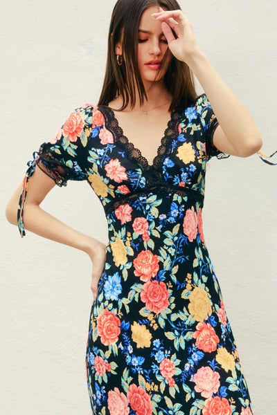 Elevate your wardrobe with the Toni Floral & Lace Maxi Dress, featuring a delicate floral print that captures effortless elegance. Its plunging neckline is beautifully accentuated by lace trim at the bust and neckline, adding a refined touch of femininity. Short sleeves provide a balanced silhouette, making this dress perfect for both casual gatherings and special occasions. The midi length ensures versatility and comfort, blending timeless style with modern grace.